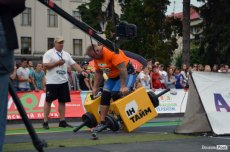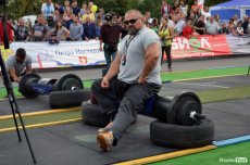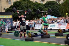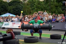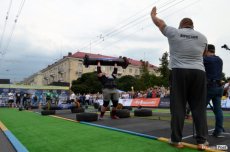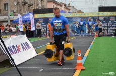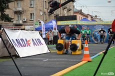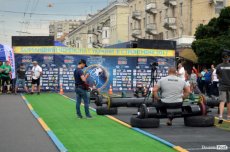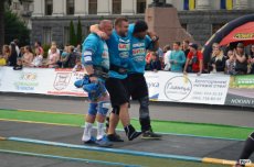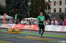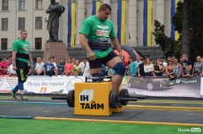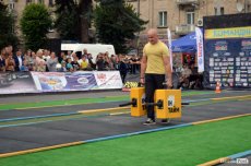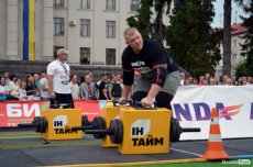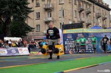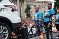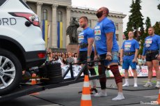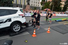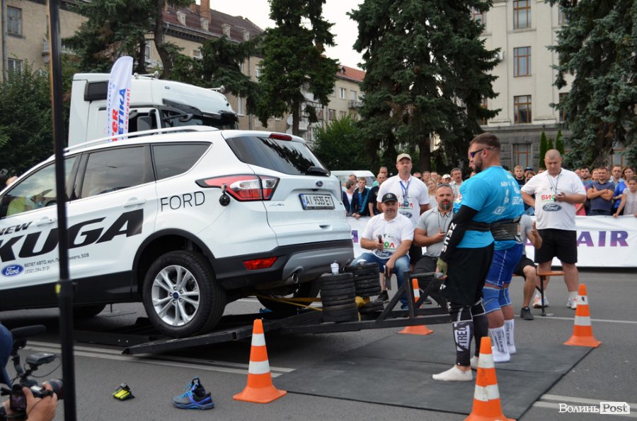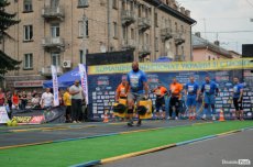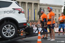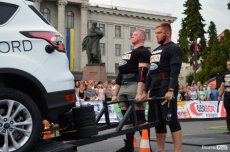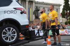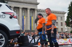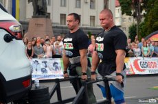 Завершальною вправою стала тяга платформи з легковим авто – її силачі виконували у парі. Аби ускладнити завдання, організатори «докинули» до маси автомобіля ще 200 кілограмів блінів. Тож на руки спортсменів випадало навантаження у 500 кілограмів.