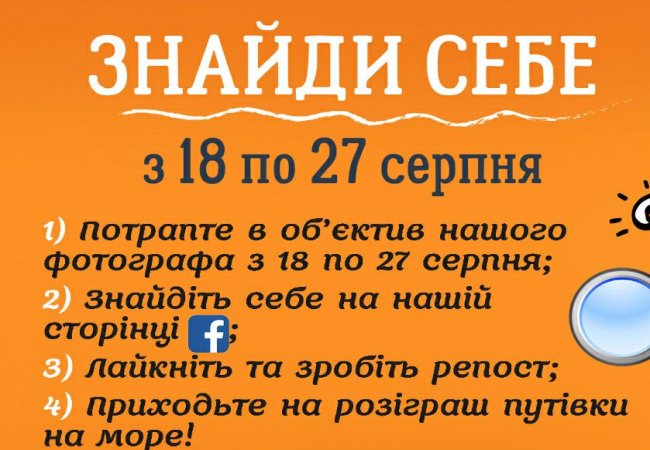 Так, 31 серпня з 18:00 до 19:30 на першому поверсі торгово-розважального центру методом жеребкування серед тих хто вподобав та поширив свою світлину буде обраний переможець конкурсу «Знайди себе». Присутність – обов’язкова. Посміхайтесь, шукайте себе, поширюйте та вирушайте на море!