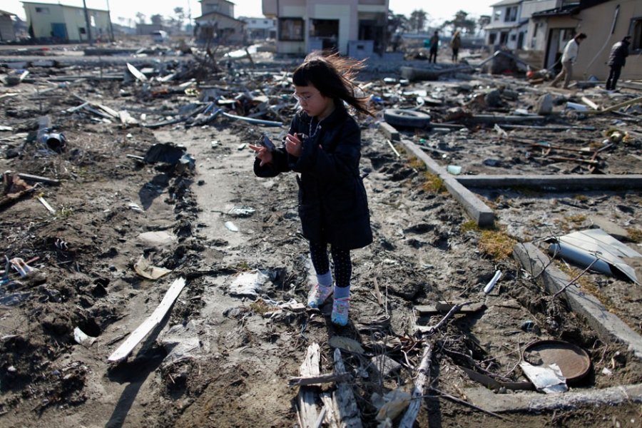 76. Семирічна Вакана Кумагаі прийшла на місце, де колись стояв її будинок, змитий цунамі 11 березня, в префектурі Міягі в першу річницю катастрофи. (TORU HANAI)