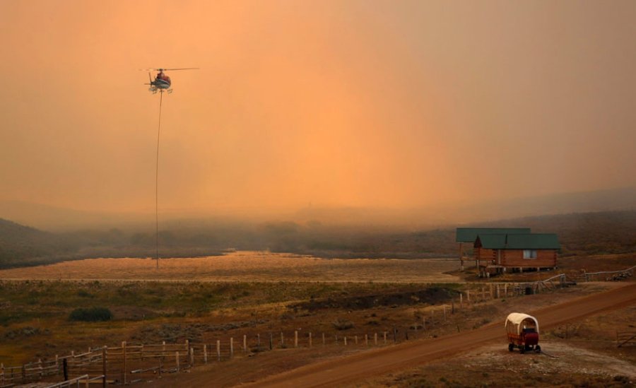 17. Пожежний вертоліт наповнює баки водою на тлі густого диму від лісової пожежі на захід від містечка Пінедейл в штаті Вайомінг 16 вересня. (JIM URQUHART)
