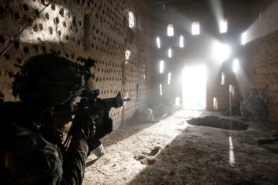 69. Американський солдат Ніколас Дікхат направляє гвинтівку у дверний отвір, після того як їх почали обстрілювати таліби під час патрулювання району в провінції Кандагар 26 квітня. (BAZ RATNER)