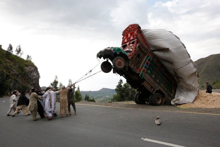 74. Чоловіки намагаються вирівняти перевантажену вантажівку з соломою на дорозі в Даргай, приблизно в 165 км на північний захід від столиці Пакистану Ісламабада, 13 квітня. (MIAN KHURSHEED)