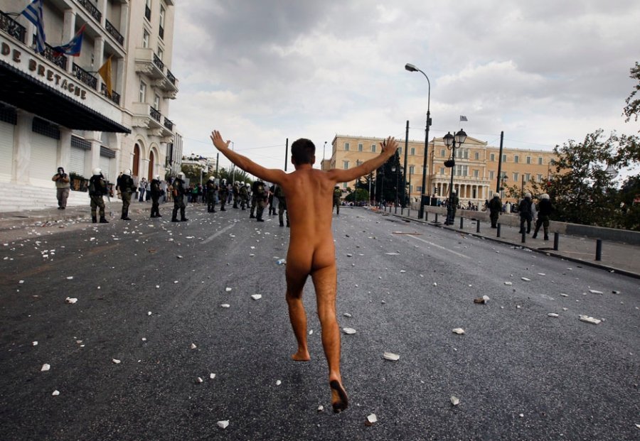 6. Голий демонстрант біжить до будівлі парламенту в Афінах під час акції протесту проти візиту Ангели Меркель в місто 9 жовтня. (JOHN KOLESIDIS)