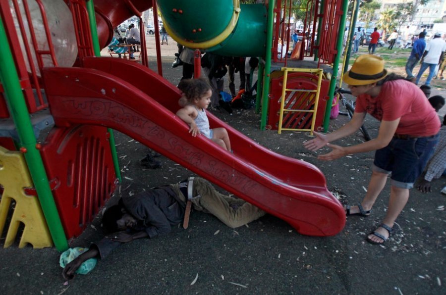 88. Суданський мігрант спить під дитячою гіркою, на якій катається ізраїльська дівчинка в парку Тель-Авіва 16 червня. За останні роки близько 60 000 африканців перетнули кордон Ізраїлю через Єгипет в пошуках роботи. (BAZ RATNER)