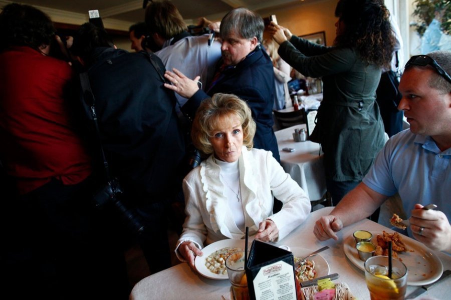 65. Жінка намагається поїсти, поки прихильники і журналісти оточили кандидата в президенти США Ріка Санторума в ресторані у Флоренції, штат Південна Кароліна, 15 січня. (ERIC THAYER)