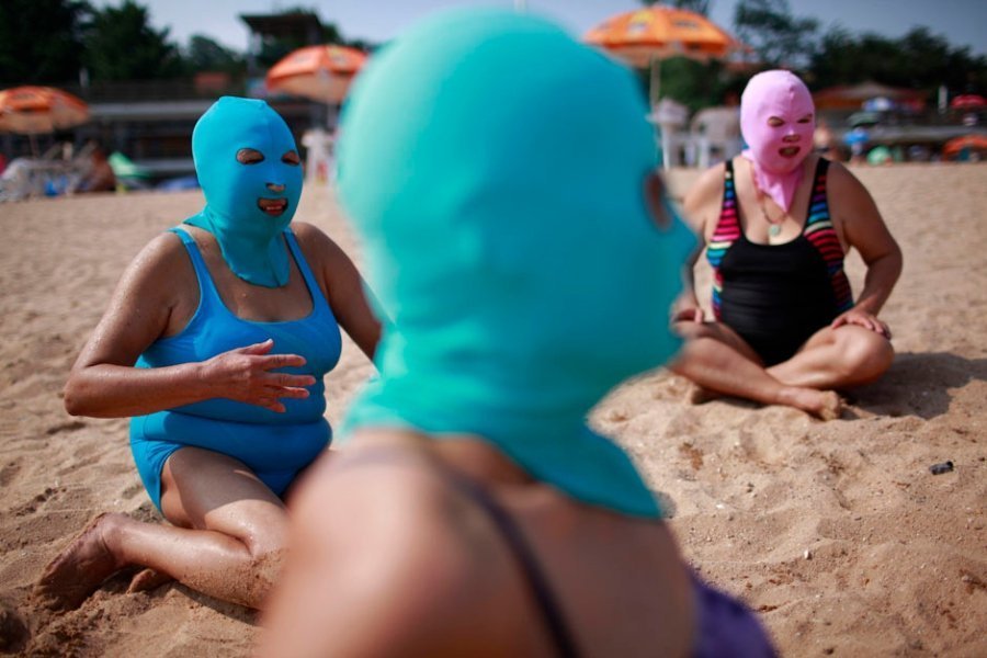 66. Жінки в нейлонових масках на пляжі в Циньдао, Китай, 6 липня. Ці маски блокують сонячні промені, але цей товар не отримав масового визнання і продається тільки в місцевих магазинах. (ALY SONG)