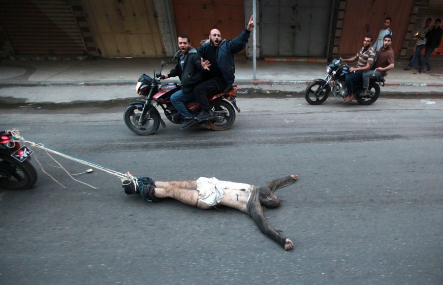 68. Палестинці везуть по вулицях Гази труп людини, яку підозрювали у шпигунстві на користь Ізраїлю, 20 листопада. Палестинці вбили шістьох ймовірних шпигунів Ізраїлю. (Mohammed Salem)