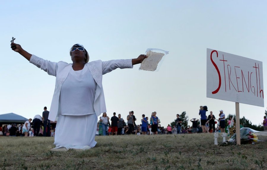 26. Марьетта Перкінс молиться під час служби в пам'ять жертв стрілянини в кінотеатрі в Аврорі, штат Колорадо, 20 липня. (SHANNON STAPLETON)