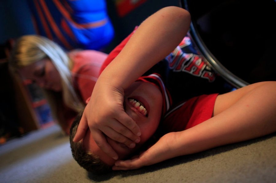35. Паркер Рус, хворий синдромом Мартіна - Белла, катається по підлозі, посварившись з сестрою в Кантоні, штат Іллінойс, 4 квітня. Синдром Мартіна-Белла - це найпоширеніша причина аутизму. І у брата, і в сестри є цей синдром, але у Паркера він розвинений набагато сильніше. (JIM YOUNG)