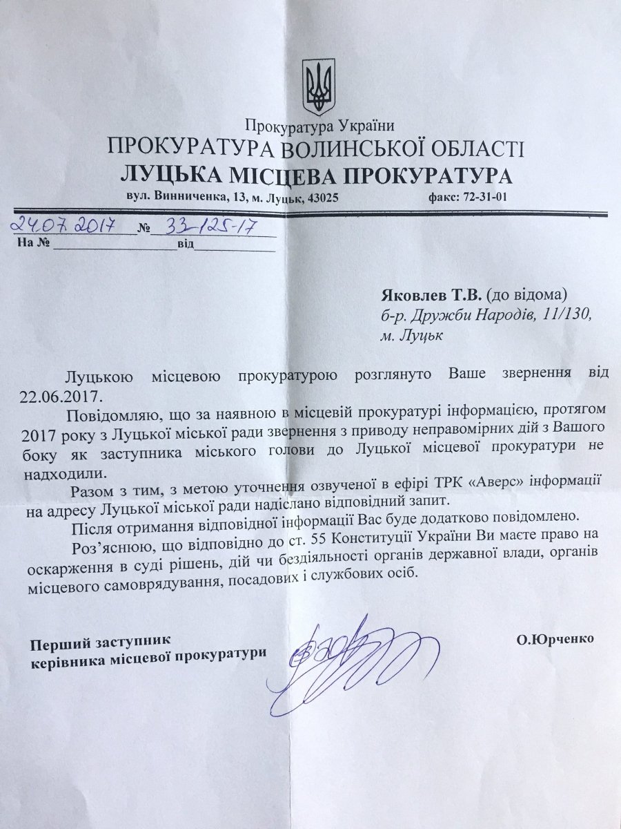 Яковлев стверджує: «15 червня 2017 року Ігор Поліщук в ефірі одного не зовсім чесного і зовсім не об’єктивного Луцького телеканалу озвучив чергові абсурдні звинувачення в мою адресу. Свої закиди він підсилив твердженням, що про ці так звані корупційні дії, до яких причетний я та мій колега Юрій Моклиця, неодноразово повідомляли прокуратуру».