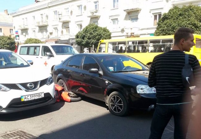 У центрі Луцька – аварія за участю мотоцикла і двох автівок.