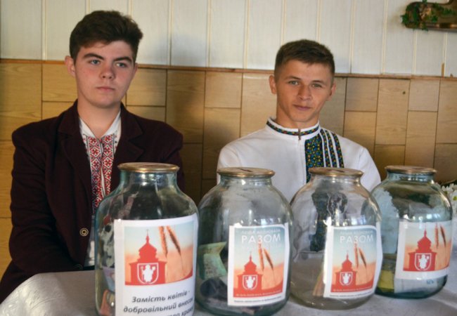У холі школи стоїть інформаційний стенд та ємності для внесення пожертв. Біля них чергують двоє школярів. Хлопці розповідають, що гості свята активно підтримують ініціативу.