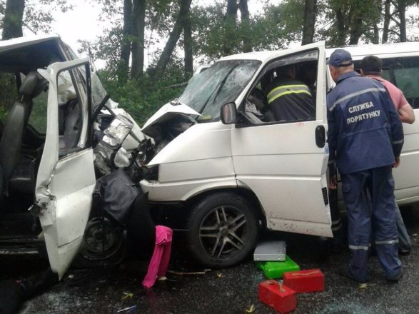 На трасі Київ-Харків-Довжанський біля села Рідкодуб Валківського району сталося ДТП. Зіткнулися 2 мікроавтобуси Ford Transit і Volkswagen Transporter.