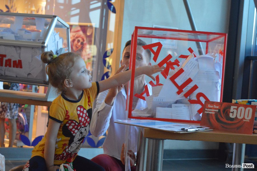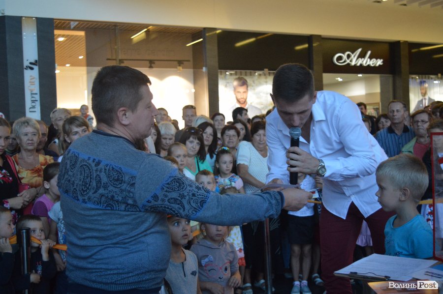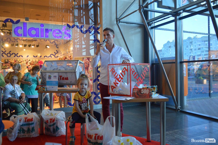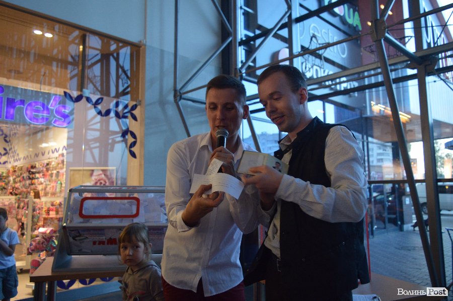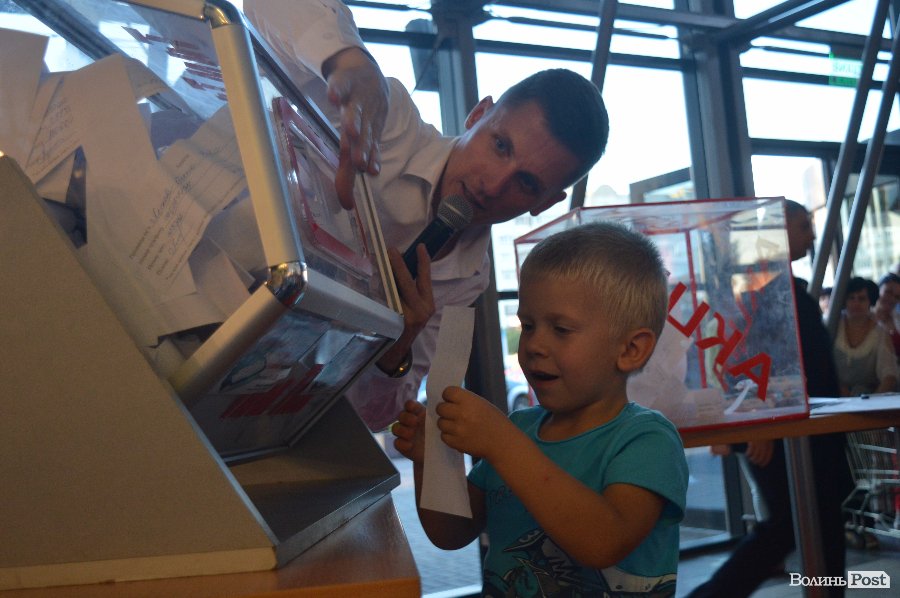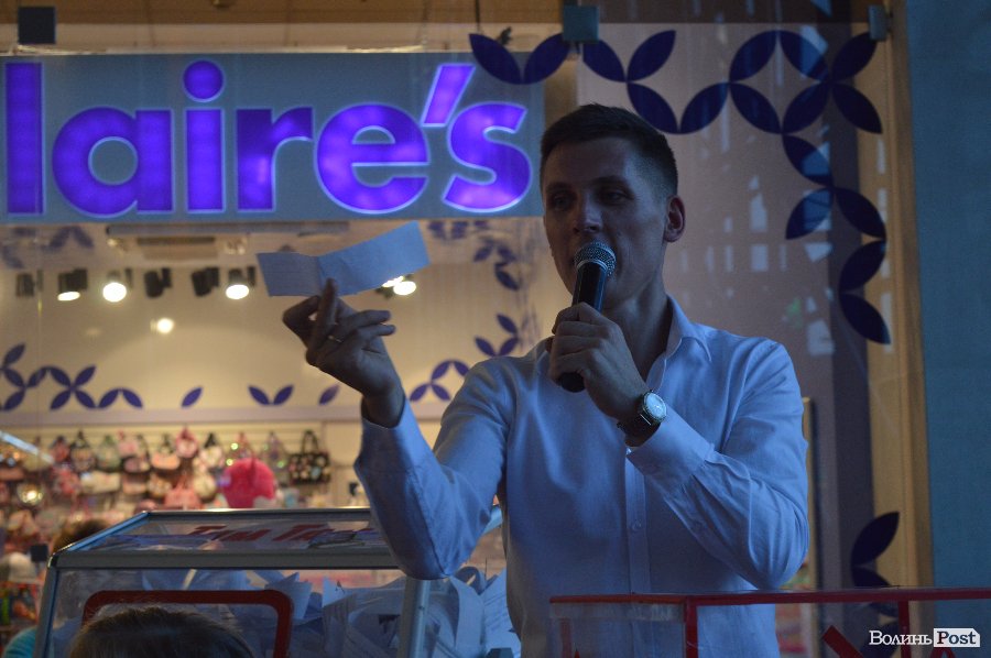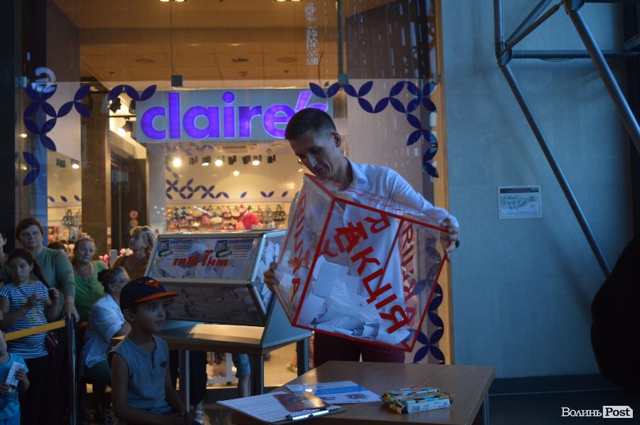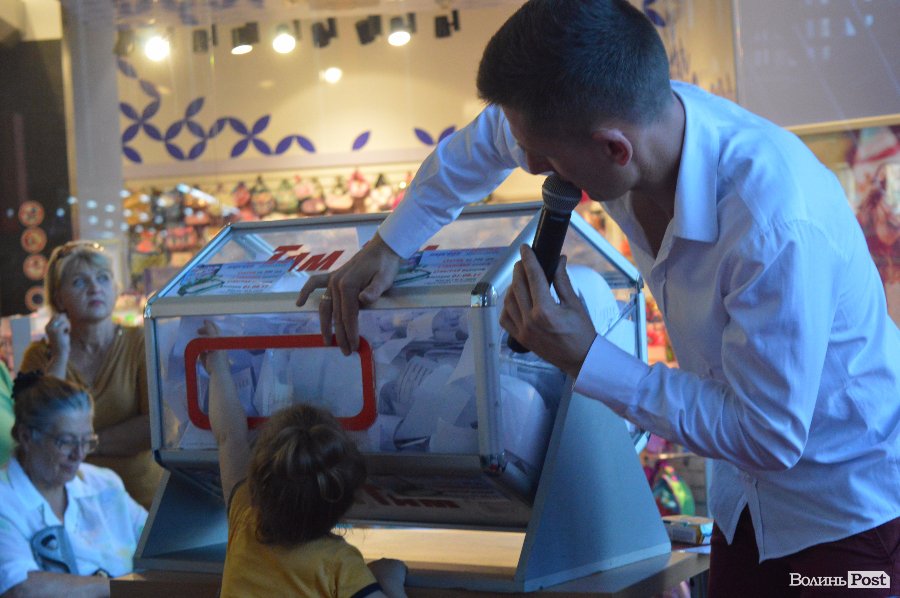 Ведучим розіграшу був Віталій Поліщук. Він крутив лототрон, а п’ятеро маленьких лучан витягали анкети. Згодом за допомогу вони отримали солодощі.