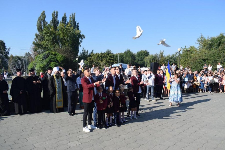 Також за традицією школярі вшанували хвилиною мовчання Героїв Небесної Сотні та загиблих у війні на сході. Як символ миру у небо випустили білих голубів.
