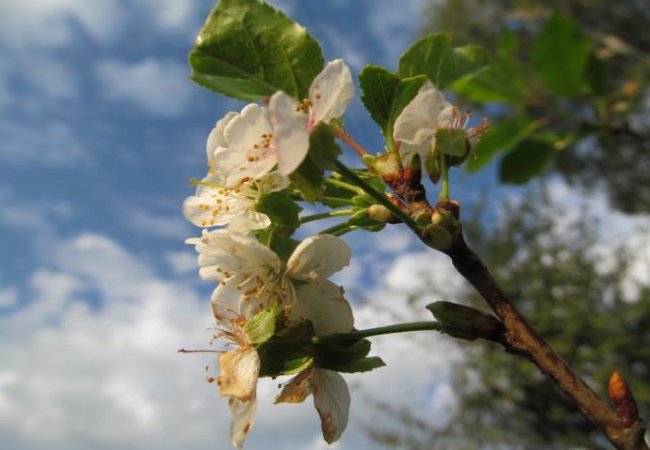Наталія Драник розповіла, що в селі Згорани, у одному із садів цього тижня плодове дерево зарясніло білими квіточками.