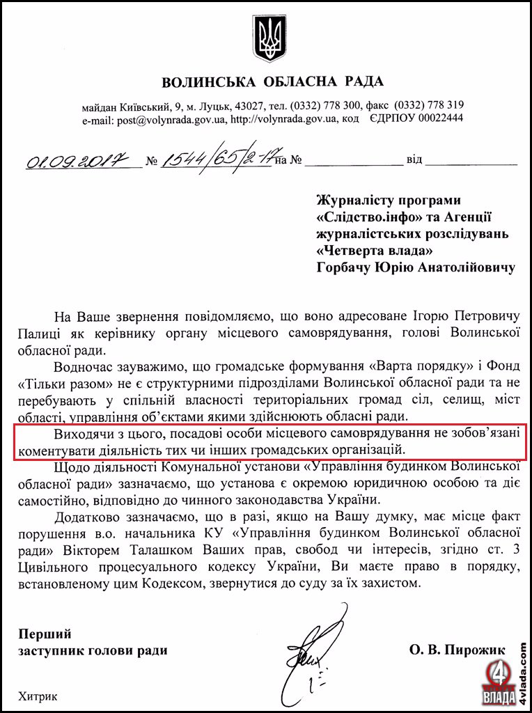 В документі за підписом першого заступника голови Волиньради Олександра Пирожика у п`яти абзацах зазначили, що громадське формування «Варта порядку» та Фонд Ігоря Палиці «Тільки разом» не є структурними підрозділами облради, тож посадові особи, в тому числі й Ігор Палиця, не зобов`язані коментувати їх діяльність.