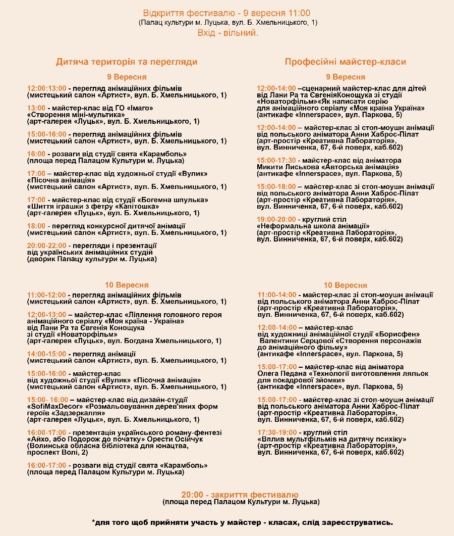 15:00-17:00 – майстер-клас від аніматора Олега Педана «Технології виготовлення ляльок для покадрової зйомки» (антикафе «Innerspace», вул. Паркова, 5). Захід розрахований на учасників студентського віку та мультипликаторів-початківців.