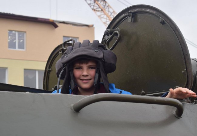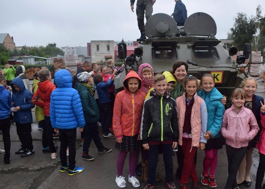 Розпочалися відвідини військової частини із презентації БТР-60 частини. Тут під контролем інструкторів школярі мали змогу оглянути бронетехніку зовні та всередині й сфотографуватися.