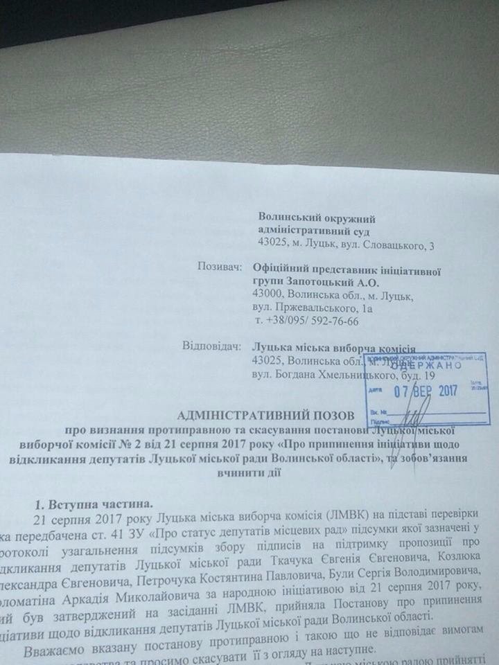 Сьогодні, 7 вересня 2017 року, депутат міської ради та керівник громадської ініціативи «Депутати, на вихід» Артем Запотоцький подав позов до Волинського окружного адміністративного суду на незаконне рішення Луцької міської виборчої комісії щодо зупинки процесу відкликання 5 депутатів-«тушок» Луцької міської ради.