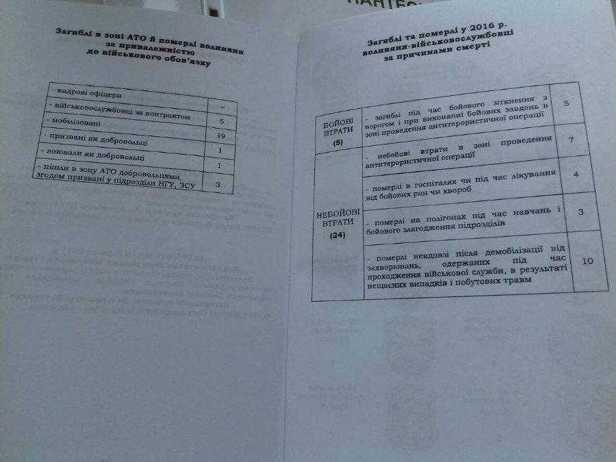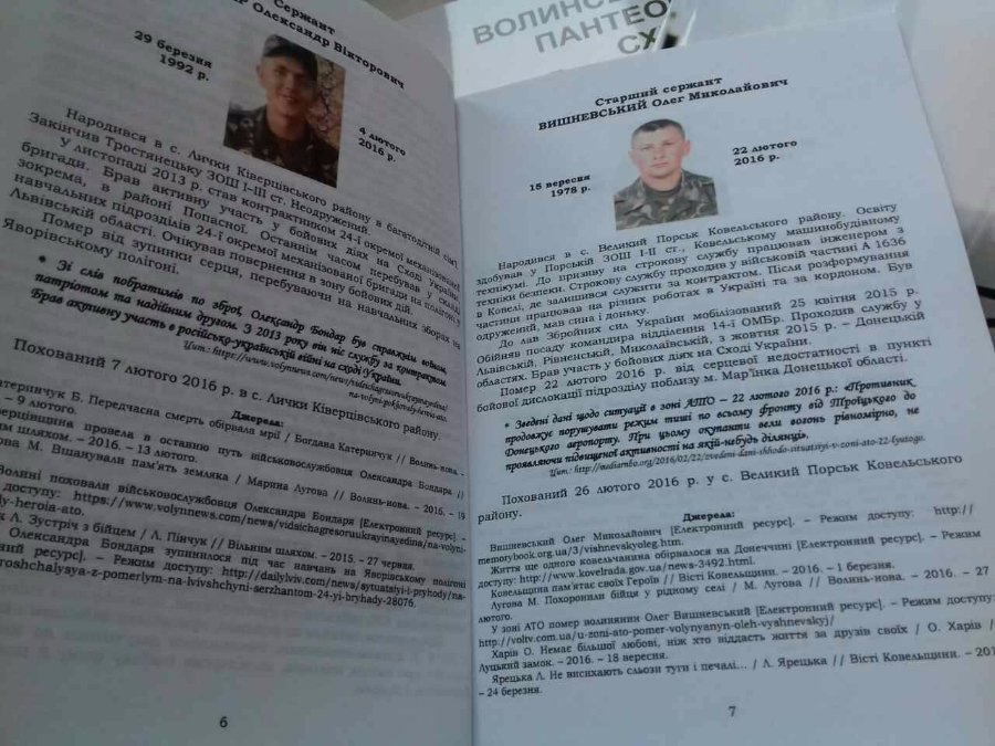 "...Побачила світ третя частина книги про волинян, які загинули в зоні проведення Антитерористичної операції на Сході України, в шпиталях та вдома від отриманих травм на фронті, а також нещасних випадків в 2016 році - "Волинський пантеон: Схід - 2016". Всього за цей період зафіксовано 5 бойових та 24 небойових втрати волинських бійців", - йдеться в повідомлені.