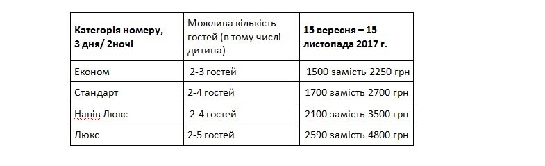 При замовленні двох номерів знижка 5% від вартості туру та пляшка смачного вина (чи настоянки на різнотрав’ї).