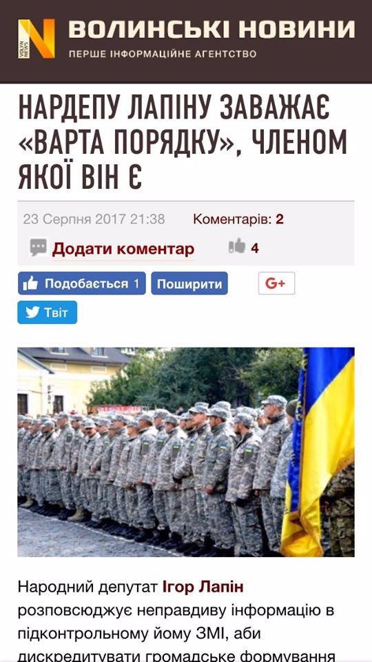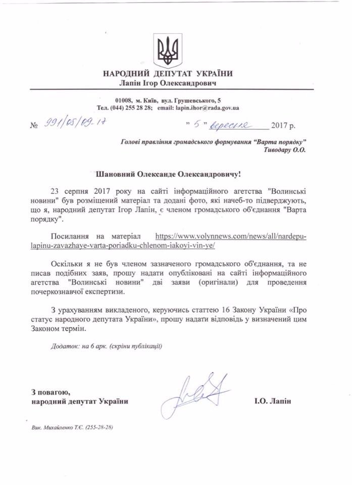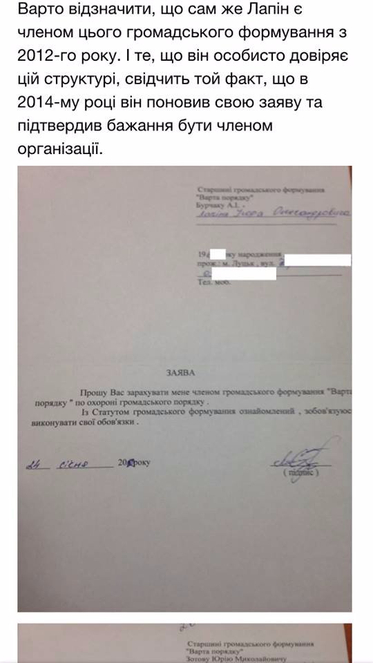 У заяві до Тиводара Ігор Лапін стверджує, що він не є членом громадського формування "Варта порядку" та не писав жодних заяв щодо вступу в ГФ.
