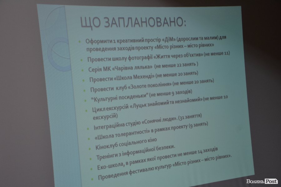 «Місто різних, місто рівних» має за мету також вирішити проблеми в сфері комунікації та дозвілля. Проект розрахований на внутрішньо переміщених осіб, які постраждали від конфлікту на Сході, ветерани АТО зі своїми родинами, особи з інвалідністю та соціально незахищені групи. Також діти, молодь та громада міста. Розпочався проект вже у серпні, ми вже провели декілька заходів. Триватиме від червня 2018-го року», - розповіла Любава Казмірчук.