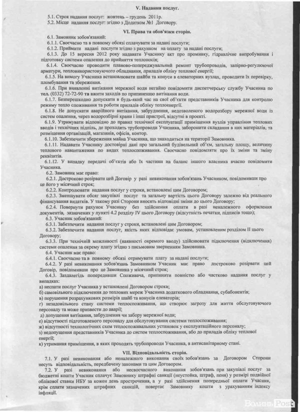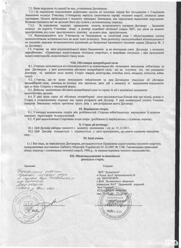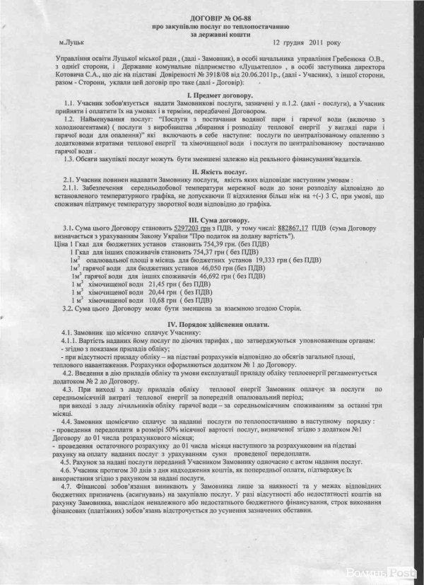 Заступник директора ДКП «Луцьктепло» Дмитро Дубняк підтвердив, що договору від 26 грудня 2011 року між його підприємством і управлінням освіти Луцькою міською ради не існує. Натомість є інший – датований 12 грудня, який передбачає ціну за 1 гігакалорію тепла 754, 39 грн (без ПДВ), - тобто саме той тариф, що затверджений Нацкомісією.