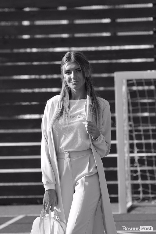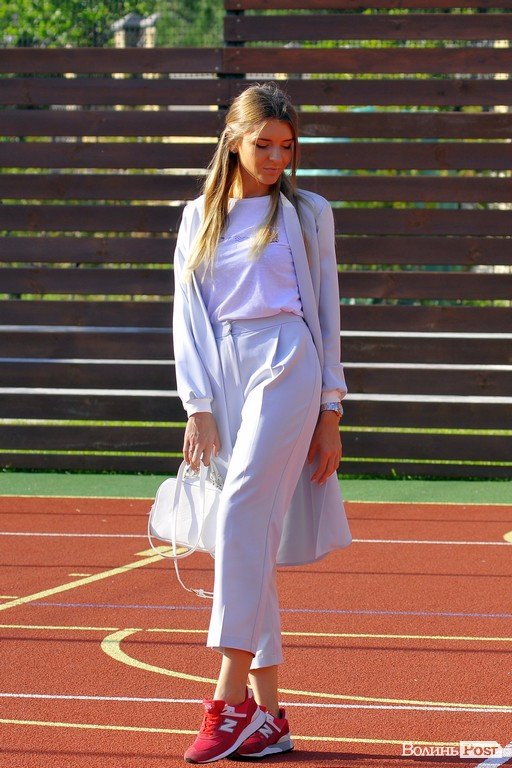 Марія обрала для свого образу кросівки New balance, футболку Reserved, сумка – Zara. Костюм українського бренду їй пошили на замовлення.