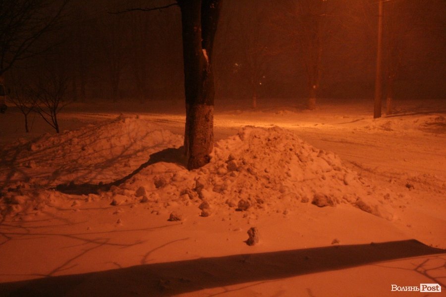 У Луцьку через сильний снігопад відламуються великі гілки дерев, падаючи на тротуар, а автомобілі безнадійно застрягають скрізь, де власники залишають їх бодай на дві-три години.