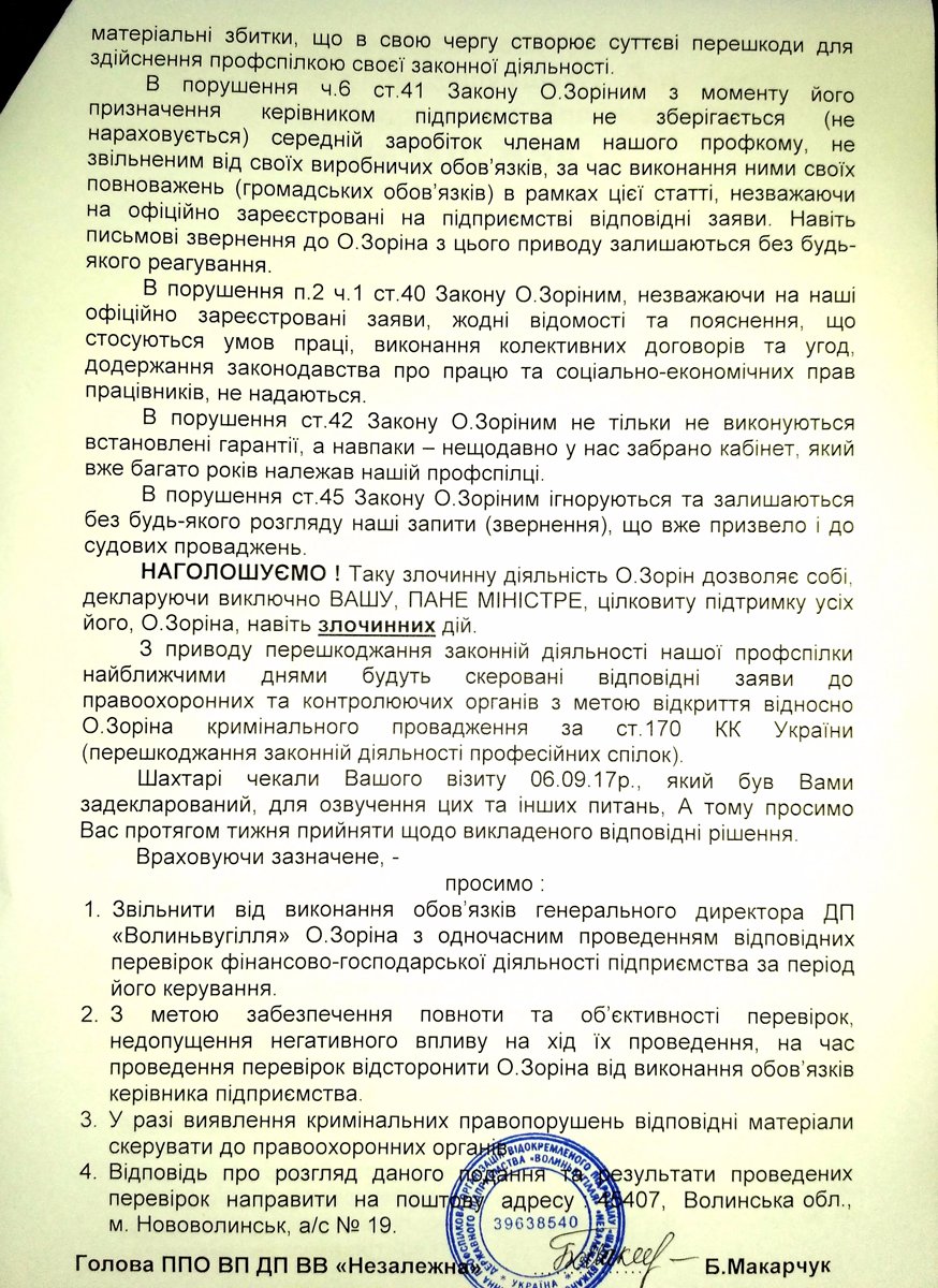 На думку гірників така бездіяльність гендиректора Зоріна прямо загрожує життю та здоров’ю працівників. По даним фактам за відповідною заявою профспілки уже відкрите кримінальне провадження від 31.08.17р. № 42017031060000052.