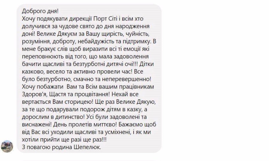 Допомогти з організацією незабутнього дня народження вирішили й у ТРЦ «ПортCity». Так, дівчинку разом з друзями запросили на розваги. Іменинниця з гостями мала змогу покататися на роликах на арені розваг «GeneratorCity», пограти у дитячому розважальному центрі «FigliMigli» та поїсти смачної піци у цьому кафе.