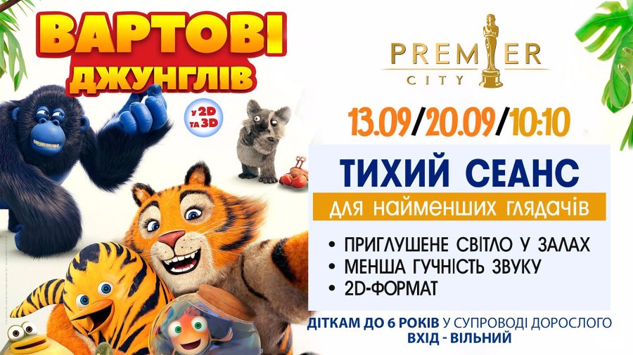 В кінотеатрі «PremierCity» відбудеться показ мультика для наймолодших глядачів. Під час тихих сеансів покажуть «Вартові джунглів».