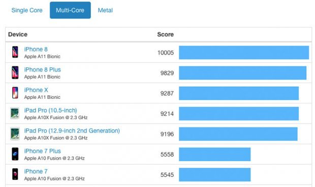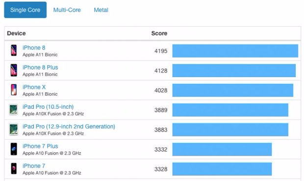 У однопотоковому тесті iPhone 8 набрав 4 195 балів, iPhone 8 Plus – 4 128, а iPhone X – 4 028.