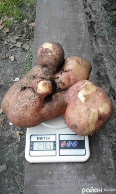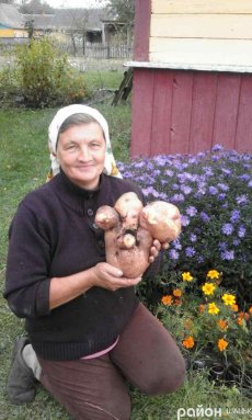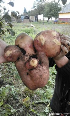 Жителька села Пехи Надія Іщук на городі викопала рекордну картоплину незвичної форми. Знахідку поклали на вагу: 2,765 кілограма.