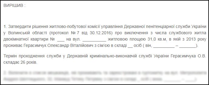 Житлово-побутова комісія управління Державної пенітенціарної служби України у Волинській області в останній робочий день 2016 року ухвалила рішення при виведення із числа службового житла квартири загальною площею 72,8 кв. м., яка у 2013 році була наданна керівнику управління Олександру Герасимчуку.