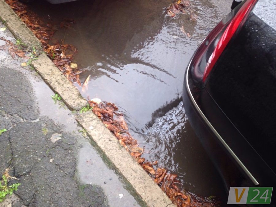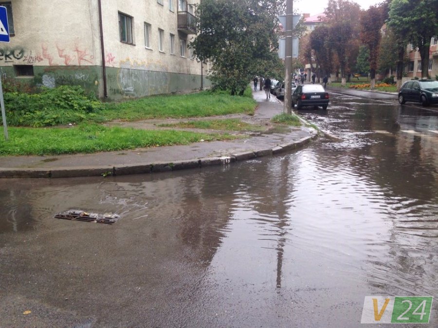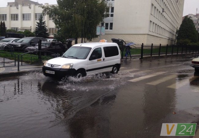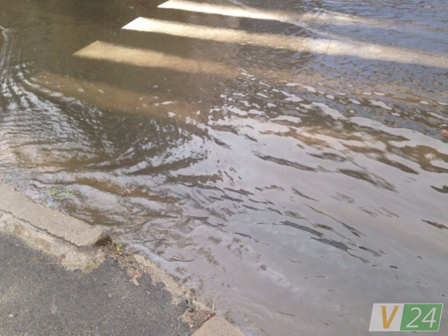 Зливні люки не справляються з великою кількістю води, тому тут з-під землі б'ють фонтани. Рівень води сягнув тротуару, повністю залило пішохідний перехід.
