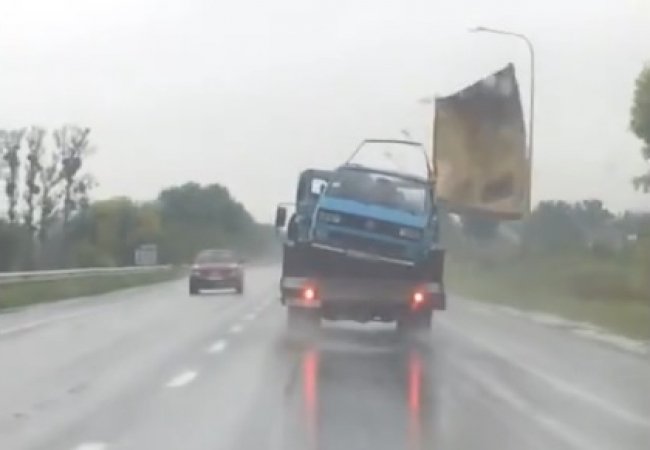 У Луцьку вітер зірвав дах автомобіля, який перевозили.