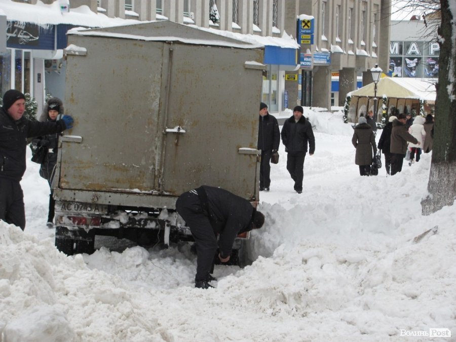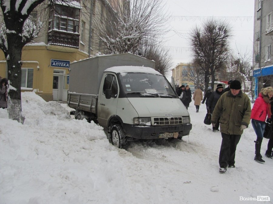 Разом з тим проблемним лишається рух транспорту – навіть у центрі міста. На вулиці Лесі Українки вантажівка добру годину вовтузилася у снігу, аби в’їхати на вулицю Крилова.