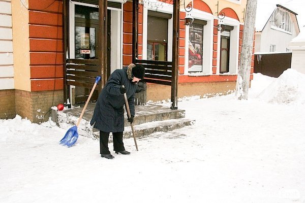 Біля навчальних закладів, громадських будівель і невеликих магазинчиків люди розчищають сніг. У кого є час і сили – звільняє від завалів усю територію перед фасадом, але більшість обмежуються доріжкою у снігу.