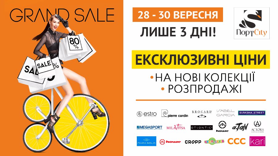 У ТРЦ «ПортCity» можна придбати одяг з літньої колекції за неймовірно вигідними цінами. Grand Sale – це супер-знижки та вигідні пропозиції від магазинів. Окрім того, на нову осінню колекцію магазини пропонують ексклюзивні ціни.