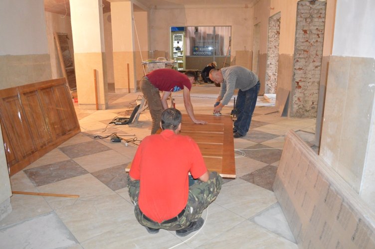 На сьогодні працює дві бригади. Спеціалісти по роботі з деревом встановлюють стінові панелі, двері. Майстри з облицювання плиткою завершують укладати підлогу.