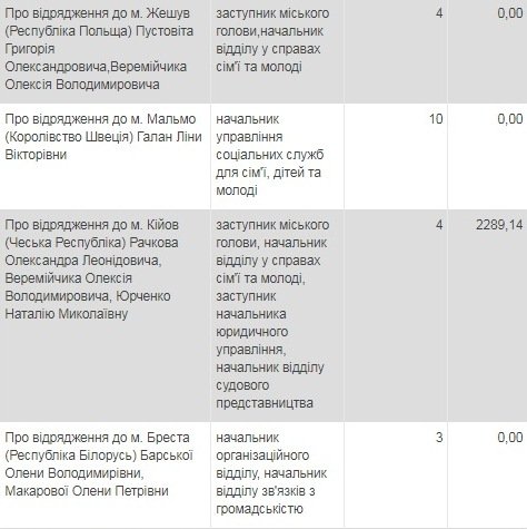 Рекордно часто посадовці їздять до Львова. Таких подорожей було 23. З них 10 разів до Львова часом одна, а часом у супроводі колег, їздила очільниця департаменту муніципальної варти міськради Юлія Сиротинська.