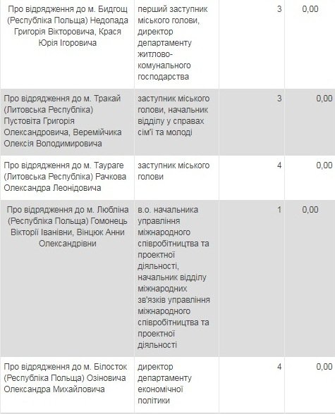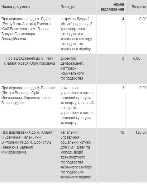 Видання запросило надати інформацію про відрядження керівників структурних підрозділів Луцькради, заступників та секретаря з початку року та до моменту запиту, тобто 22 вересня. Окрім місця призначення, попросили вказати витрати з міського бюджету, які пішли на ці поїздки. З'ясувалося, що доволі часто такі відрядження додаткових витрат не несуть. Це пояснюється тим, що витрати оплачує інша сторона, або сам посадовець. Поза тим, витрати на відрядження у зазначений період становили майже 24 тисячі гривень.