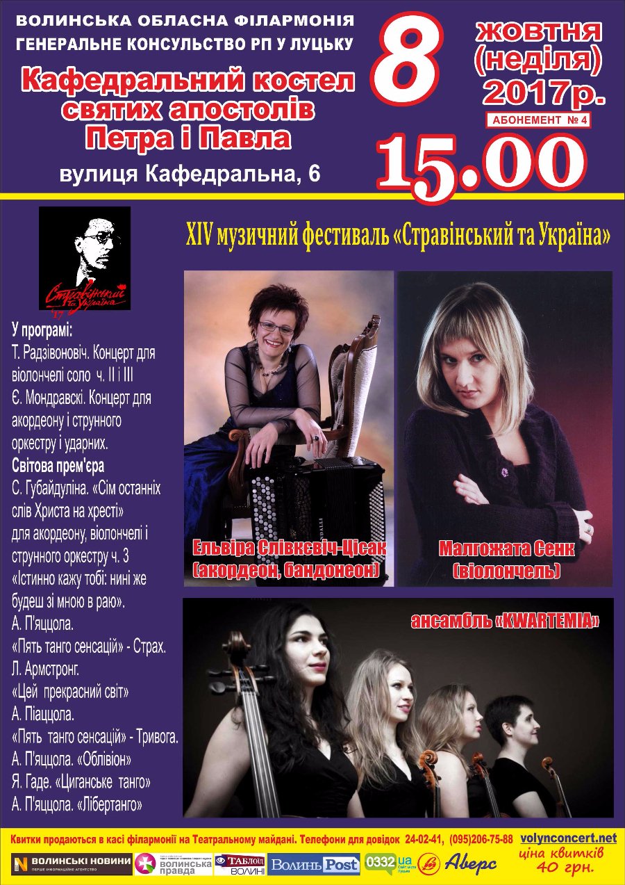 8 жовтня (у неділю) о 16:00 любителів музики запрошують до Кафедрального костелу святих апостолів Петра і Павла на концерт відомих виконавців із Республіки Польща – Ельвіри Слівкевич-Цісак (акордеон, бандонеон), Малгожати Сенк (віолончель), ансамблю «KWARTEMIA».
