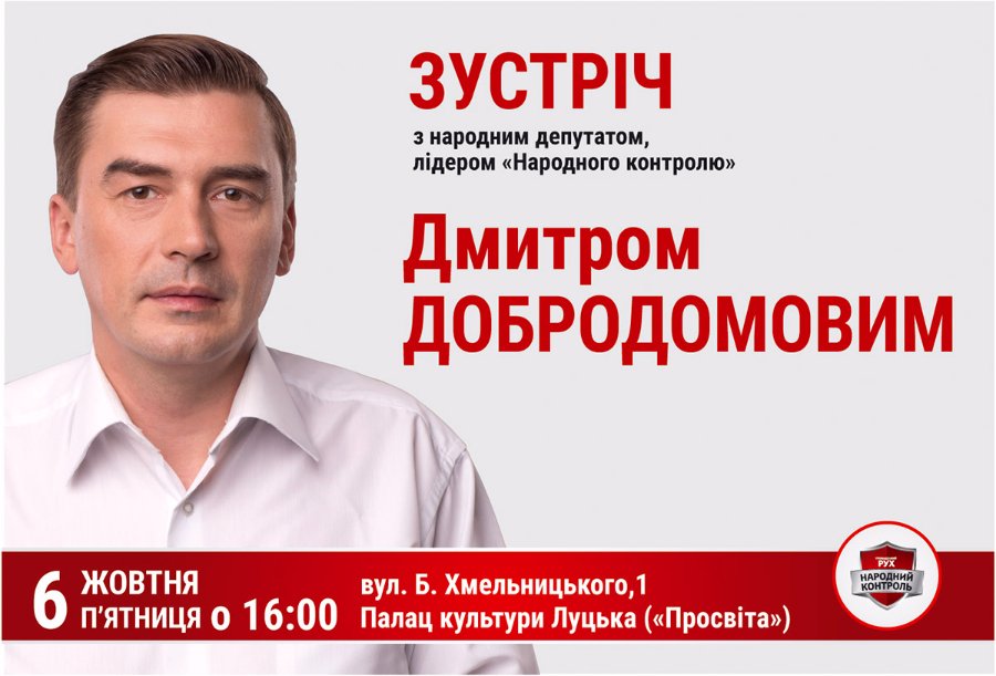 Луцьк 6 жовтня відвідає народний депутат, лідер політичної партії «Народний контроль» Дмитро Добродомов.