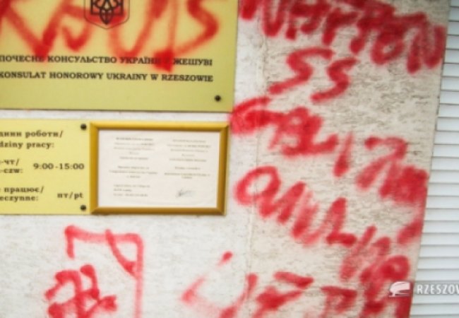 На будинку консульства невідомі вандали написали польською мовою: "Україна - ОУН-УПА", "Waffen SS Galitzien", біля герба України намалювали шибеницю і напис Raus (нім. мовою "геть"), свастику і напис російською "нет".