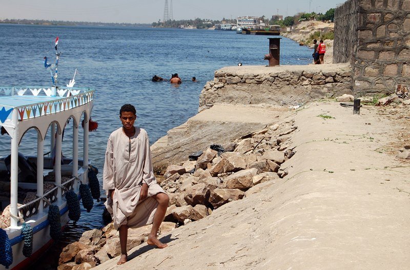 2011 рік. Єгипет, Луксор. Узбережжя Нілу. На задньому плані - місцеві купають у річці коней, рятуючи їх не лише від бруду, а й від нестерпної спеки. На передньому плані - молодий єгиптянин задивився на світловолосих дівчат, яких тут ой як люблять...