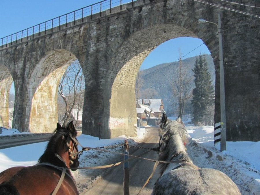 Бричка «Ворохта». То є бричка «Ворохта», що має дві кінські сили, як видите! Та бричка возила нас від дому до гірки, на якій ми робили сальто на лижах. А добралися ми сюди на знаменитому «раховозі», то такий потяг «Івано-Франківськ-Рахів». Гори – це особлива місцина нашої країни. Я їх дуже люблю. с. Ворохта, Івано-Франківська область, 29 січня 2012 року.
